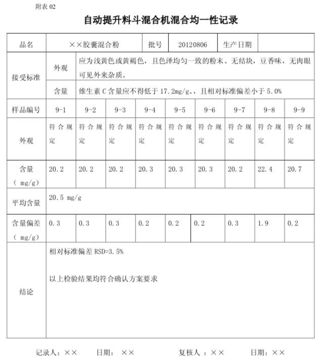 注:各点检测结果应符合《××胶囊中间产品质量标准》各项要求,且维生素C含量9个点的相对标准偏差应小于5.0%。