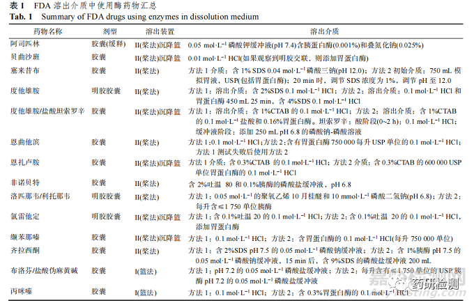 明胶交联可能导致溶出过程中囊壳内部或外 部表面形成不溶于水的薄膜,阻止胶囊填充物的 释放。痕量醛(如甲醛、戊二醛、乙二醛等)引起 的交联是最常见的,此类交联需使用酶断裂交联 的肽键。此外还有三价金属离子(如 Fe3+和 Al3+)和 明胶中离子(如羧酸根、铵根)介导的较弱的离子交 联,一般可以通过更改介质的离子强度或 pH 值来 破除[6]。只有研究表明确实为明胶交联导致胶囊溶 出度不符合标准,才可在介质中添加酶。FDA 收 载的溶出介质使用酶的一些具体药物见表 1。