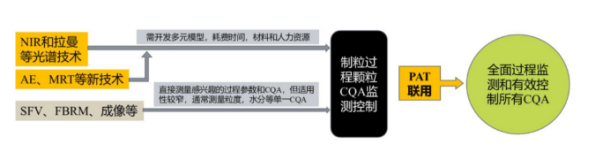 在制药工艺过程中,制粒的工艺参数和材料属性的数量是非常多的,所以不存在通用的过程分析技术。因此,在制定过程监控策略时,必须综合考虑不同制粒技术过程特性和过程分析技术能力。PAT工具能够在制粒过程中产生大量适用的数据,结合其他PAT工具进行有效的过程监控,有利于对制粒过程进行全面的设计、分析和控制。但是,现有方法存在许多缺点和局限性,需要技术人员结合实际生产工艺进行大量的研究和开发,方能实现PAT技术准确预测终端产品的质量属性。随着新GMP的推进,对制药企业的全产业链、全生产过程、生产环境、药品质量检测评价等各方面要求更加严格,过程分析成为药物分析的一个重要内容。