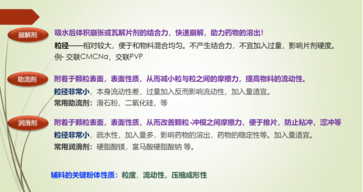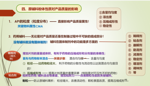 制备工艺选择主要依据:①药物的稳定性②原辅料的基本性质。然后从整个制粒压片工艺流程(粉碎-过筛,混合,制粒,压片等)为我们详细解说原辅料粉体性质对药物产品质量的影响;制粒作为片剂生产的关键技术,制粒的成败不仅影响物料的流动性,而且影响压片过程的顺利进行,如出现粘冲,裂片,含量不均等不良现象发生。换句话说,粉体性质的变化直接影响固体制剂产品质量和制剂过程的顺利进行。根据药物的性质与产品质量的要求选择适宜功能辅料,有效利用辅料的粉体性质是保证固体制剂的产品质量,制剂过程顺利进行的关键。
