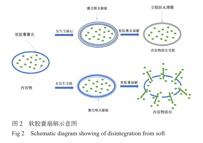 有研究表明,软胶囊发生老化崩解迟缓是由于囊壳中的明胶与醛类化合物发生交联反应所致,其交联机制可能为赖氨酸的一个自由氨基与醛基反应,生成一个亚胺基团,再经一系列的缩聚反应,最终生成交联化合物,其交联过程详见图1。该交联化合物阻挡了水分子进入,致使囊壳内壁生成一层不溶于水的薄膜,进而阻止软胶囊内容物的释放,软胶囊崩解示意图见图2。
