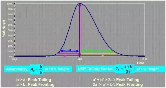 理论上讲,色谱峰应符合高斯曲线分布,然而实际上任何色谱峰都对高斯曲线分布存在一定的偏离,亦即不对称。峰拖尾可以用不对称因子(As)或USP拖尾因子(Tf)来衡量,显然不对称因子的说法更准确,因为色谱峰存在前延、完美对称、拖尾三种形态。一般来说,制药行业以USP拖尾因子作为评测标准,而其他行业则多采用As来测定峰形。