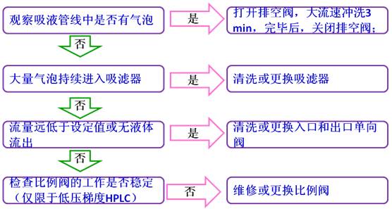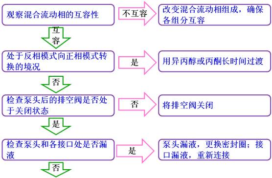 通常情况下,泵压的变动值超过了0.5 Mpa,系统压力就属于不稳定的范畴。导致系统压力不稳定的最直接原因为流动相流量和组成输出的不稳定,而导致流动相输出不稳定的原因通常包括溶剂互容性较差、系统漏液、系统存在气泡以及输液系统部件工作失效等等。下面将介绍排除“系统压力不稳”的方法。
