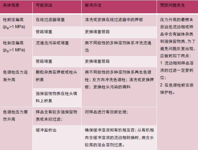 以上情形假设没有安装保护柱,如果安装了保护柱,压力升高时应先测试保护柱的压力,以便确认问题是否来自保护柱。