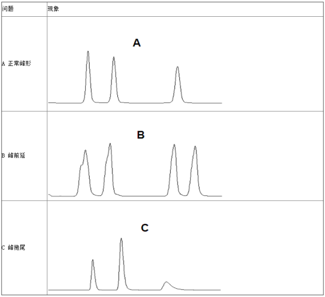 理想的色谱峰遵循正态分布,应该符合高斯曲线,是完美而对称的峰形(如图A);然而由于化合物性质的特殊性、色谱柱故障、操作条件等问题存在,峰形可能会不对称,前延(B)或拖尾(C)。