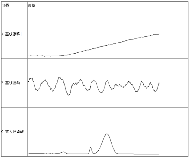 基线不稳定是指色谱曲线在较长时间范围内对响应值的0刻度较大的偏离,通常包括基线漂移(单方向)、基线起伏(规律的上下起伏)、区域宽度极大的色谱峰三种情况