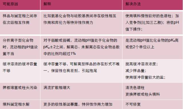 柱床塌陷是指色谱柱使用一段时间后色谱柱入口处的柱床产生可见的空隙。该空隙的存在增大了死体积,会导致色谱柱柱效下降。造成柱床塌陷的原因如下:其一,色谱柱填装时的压力过低,填装不紧密,在高压下使用一段时间,开始出现空隙;其二,操作压力超出色谱柱填料的耐压值,导致填料颗粒破碎产生空隙;其三,流动相溶解填料导致空隙出现。键合相塌陷是指由于流动相极性与键合相极性相差太大,键合相无法在流动相中充分伸展而倒伏、缠结在一起,比如普通C18在纯水相条件下。相塌陷会导致色谱柱对化合物的保留不足。