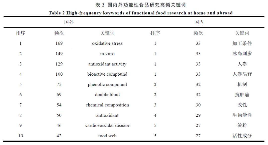 通过对文章总结凝练后提取出的关键词,可充分体现该研究的内容与价值,同时高频关键词通常也被视为某个领域研究热点问题的指向标[27]。为了探索国内外功能性食品的研究现状与热点的异同之处,本研究运用cite space 软件对文献的关键词进行可视化分析,国外研究选取Web of science 数据库,以“Functional food”和“Nutraceutical”为关键词的进行检索,选取所有综述文章,经选取删除后共纳入1769 篇有效文献。国内研究选取中国知网数据库为平台,以“功能性食品”为关键词进行检索,选取北大核心期刊,经筛选后共获得385 篇有效文献。分析发文量结果显示,国内外发文量虽然有上下浮动,但都呈上升趋势,功能性食品领域正在吸引越来越多的团队进行研究。分析高频关键词结果,国内外功能性食品文献中出现频率排名前十位的关键词如表2。可见国外关于功能性食品的研究主要围绕氧化应激[28]、生物活性[29]、化学成分[30]以及实验方法等方面展开,而国内则主要围绕功能食品的加工工艺、原料、作用机制、活性成分等方面展开[31]。总体而言,国内功能性食品的研究聚焦食品或其成分的具体功能,研究成果容易通过食品标签中的营养标签得以展示,从能达到提升产品附加值的目的。相较于国内,国外的研究则更为宏观[32],在功能性食品的认知态度以及管理方面拥有更多成熟先进的经验。