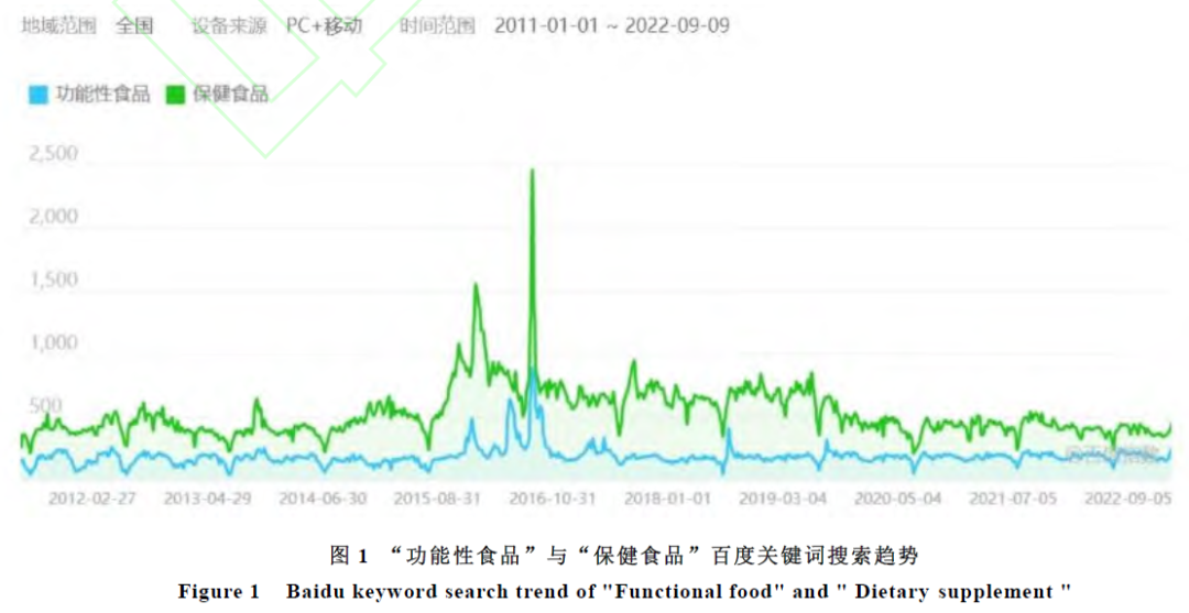 通过百度指数搜索“功能性食品”和“保健食品”,时间跨度为2011 年1 月1 日至2022年9 月9 日,得出结果如图1,由图可知功能性食品与保健食品搜索量波动幅度呈相同趋势。其中,2016 年《保健食品注册与备案管理办法》发布后,“保健食品”网络搜索指数出现明显激增。由此可见,消费者对“功能性食品”和“保健食品”的关注度相同,进一步说明,消费者对“功能性食品”和“保健食品”的异同可能尚不清楚。