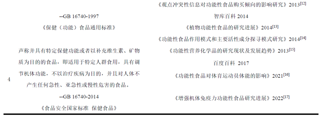 从表1 可发现,国内对于功能性食品定义的引用主要分为四大类。