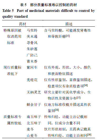统一、明确的药材标准对加强药材质量监督管理有着十分重要的意义。部分药材暂未被收录进《中国药典》2020年版,或曾具有官方药用标准,但被国家食品药品监督管理局逐步取消,如含有马兜铃酸的马兜铃、关木通等[31]。个别药材,现行质量标准较低,仅主要通过药材或饮片性状对药材质量进行控制,制成配方颗粒后,无法从配方颗粒性状上对其进行质量控制,如椒目、紫河车等。椒目始载于《本草经集注》,为甘肃省地方习用药材,现有质量标准载于甘肃省中药材标准(2009年版),仅有性状、显微鉴别描述[32]。而紫河车在《中国药典》2015、2020年版中均未被收录,在《中国药典》2010年版标准中只有外观、形状等表面特征的描述,缺乏鉴别、检查、含量等控制指标[33]。一些药材质量标准专属性较低,如五味子(北五味子)和南五味子相似度极高,仅在成分的含量上有所不同[34],制成配方颗粒后,难以对其进行质量控制。此类药材制成中药配方颗粒后,质量无法得到有效保证,建议不宜制成配方颗粒,见表5。