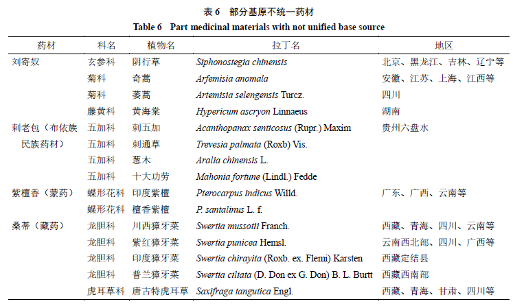中药材的基原对药材的质量及功效有很大影响,明确药材基原对药材质量控制和新药研发有重要意义。部分药材存在基原混乱、基原标准不统一等现象,对药材的进一步加工造成困难。如刘寄奴分为北刘寄奴和南刘寄奴,前者来源于玄参科植物阴行草Siphonostegia chinensis Benth.的干燥全草,后者来源于菊科植物奇蒿Arfemisia anomala S. Moore的干燥全草,在《中国药典》2020年版只收录了北刘寄奴。而在《浙江省中药炮制规范》(2015年版)中只收载了南刘寄奴,这说明南刘寄奴为该省的习用药材[44]。同时,不同的地区对于刘寄奴这一药材的来源也有不同的规定[45]。民族药中药材基原混乱的问题也比较突出,见表6。这一类药材不便于质量控制,制成中药配方颗粒后更难以控制其质量。
