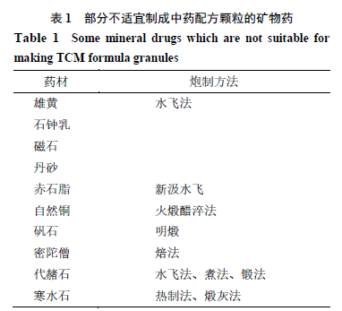 我国的矿物药使用历史悠久,具有镇静安神、平肝潜阳等作用,在临床使用中具有很强的灵活性[5]。大部分矿物药通常含有重金属汞、砷、铅等元素,使用不当易对肝、肾等器官造成严重损害,甚至使患者死亡[6]。而要消除或降低矿物药毒性,一般需要进行炮制,如净制法、水飞法、干热法、煮法、复制法等,工艺复杂,且有许多炮制方法已失传[7]。同时,由于受到生产工艺和现行技术要求的制约,矿物药标准汤剂的制备具有很大难度,一方面由于缺少规范统一的生产制备工艺标准,另一方面由于药材的特殊性,不同的提取浓缩条件极易使微量元素的存在状态产生变化,从而影响疗效。如自然铜中以铁离子,尤其是亚铁离子为主要成分,但处理过程中温度过高则生成磁性氧化铁,影响有效成分溶出[8]。芒硝在与浓缩颗粒混合或参与浓缩制粒时,容易出现溶解不充分、受热不均匀的现象,从而引起爆沸[9]。在实际生产中,对于提取时间及提取温度的把握有很大的难度。同时,矿物药的出膏率低,也影响着后续颗粒的制备[10]。因此,大部分矿物药不宜制成中药配方颗粒,见表1。
