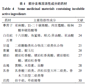 部分药材主要活性成分脂溶性较大,难溶于极性大的溶剂,水提效率低,工业中往往使用有机溶剂进行提取,不符合现行中药配方颗粒质量标准技术要求。因此,此类药材不宜制成中药配方颗粒,见表4。