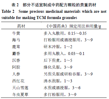 中药材的生长年限、资源量直接影响了中药材的价格,一些具有特殊功效的药材受到人为追捧,也导致了其资源稀少,价格高昂,此类药材制成中药配方颗粒,将会面临原药材稀缺、成本高昂等问题。同时,一些贵重药材,较少的用量就能引起较明显的疗效,在《中国药典》2020年版或经典本草著作中要求单独服用,此类药材也不宜制成中药配方颗粒,见表2。