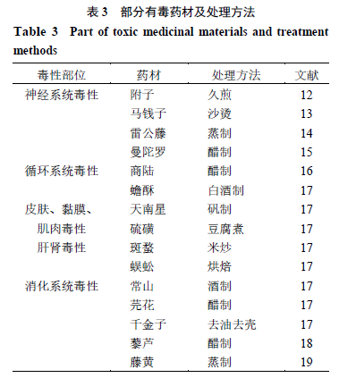中药材的毒性分级传统上可分为3类:有大毒、有毒、有小毒等[11]。现代分类根据作用部位的不同可将其分为中枢神经毒性作用、循环系统毒性作用、消化系统毒性作用、肝肾功毒性作用以及皮肤、黏膜、肌肉毒性作用,见表3。此类药材通常需要特殊方法处理降低毒性,用量用法也因人而异。如中药附子,《中国药典》2020年版载其用法为先煎、久煎,同时有研究显示,附子大剂量时需用开水久煎3 h以上[12]。而现行版《中药配方颗粒质量控制与标准制定技术要求》中对于煎煮时间的要求一般为一煎30 min左右,质地较硬和滋补类药材可以适当延长,久煎明显不符合技术要求规定。商陆经醋煮后可明显降低其毒性,但处理方法与现行技术要求中规定的溶媒水相冲突。因此,此类药材不适合制成中药配方颗粒。