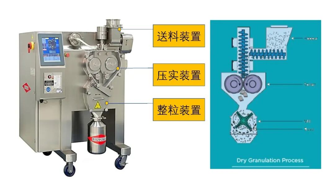在干法制粒工艺中,干法制粒法是将药物和辅料的粉末混合均匀、压缩成大片状或板状后,通过粉碎整粒步骤制成所需大小颗粒的方法。该方法靠压缩力使分子间产生结合力,其制备方法有压片法和滚压法。