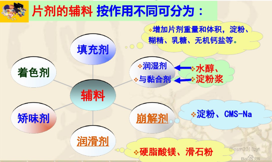 崩解剂的加入使颗粒或片剂在体内迅速分裂成细颗粒。崩解过程经历润湿、虹吸、破碎。淀粉是最广泛应用的崩解剂,在湿法制粒中淀粉常用于稀释剂和粘合剂。淀粉与微晶纤维素混合使用获得出色的崩解效果。近年来开发应用的高分子崩解剂一般比淀粉的用量少、且明显减少崩解时间,这些性质有利于水不溶性药物的片剂。
