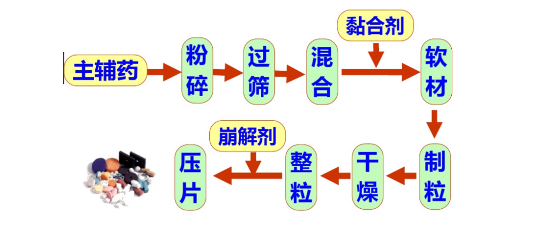 片剂是目前品种最多、产量最大、使用最广泛的剂型之一,片剂的制备分为直接压片法和制粒压片法,后者根据生产工艺又分为湿法制粒工艺和干法制粒工艺,而传统的湿法制粒工艺仍然是药品生产中的主流工艺。湿法制粒(wet granulation)是在药物粉末中加入液体粘合剂,靠粘合剂的架桥或粘结作用使粉末聚结在一起而制备颗粒的方法。由于湿法制粒的产物具有外形美观、具有生产工艺成熟,颗粒质量好,生产效率高、流动性好、耐磨性较强、压缩成形性好等优点,在医药工业中的应用最为广泛。而对于热敏性、湿敏性、极易溶性等特殊物料可采用其它方法制粒。