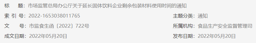 《市场监管总局关于加强固体饮料质量安全监管的公告》(2021年第46号)(以下简称《公告》)发布以来,有关食品行业协会、固体饮料生产企业和地方市场监管部门陆续反映,受新冠肺炎疫情影响,部分固体饮料生产企业现有产品包装材料有一定数量的剩余。为严格执行《公告》,减少浪费,帮助企业纾困解难,经研究决定,固体饮料生产企业现有产品包装材料在2022年6月1日前未使用完毕的,可以延期使用至2022年12月31日。