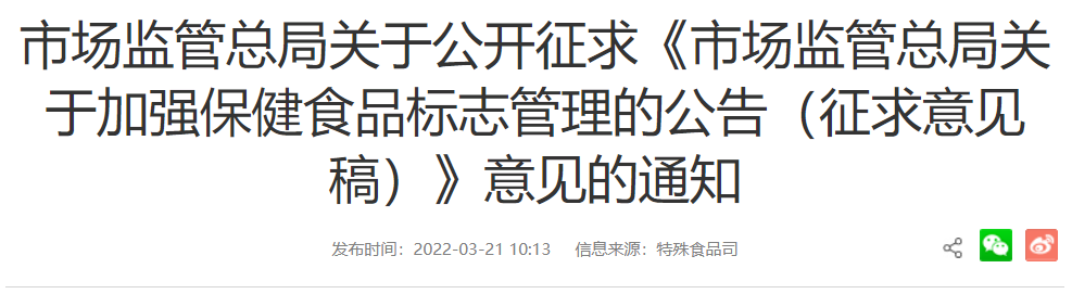 为进一步贯彻落实“四个最严”要求,规范保健食品标志管理,维护消费者合法权益,依据《中华人民共和国食品安全法》及其实施条例等规定,市场监管总局组织制定了《市场监管总局关于加强保健食品标志管理的公告(征求意见稿)》,现面向社会公开征求意见。意见反馈截止日期为2022年4月21日。公众可以通过以下途径和方式提出意见: