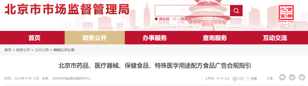 近日,北京市市场监督管理局发布了《北京市药品、医疗器械、保健食品、特殊医学用途配方食品广告合规指引》,详情如下: