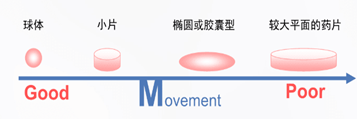 (2)片形大小和形状会对包衣效果造成一定影响。有些片形并不适合包衣,例如片芯边角比较尖锐,容易导致包衣片磨损问题;胶囊型的片形或者平面片容易造成粘片“双胞胎”问题。包衣出现问题最少的片形应该是圆的双凸面片形。如果选择异形片,则需要厚度适中,片中央弧度适中,边角处也应具有一定的圆度,要保证片子在包衣锅内流畅的自然翻滚,翻滚越好,则成膜越均匀,包衣效率越高,否则片子在锅内翻滚流动性就会较差,甚至会出现片子贴着锅壁打滑,影响成膜效率,还会出现片面磨损的问题。另外当片芯大小的直径超过11mm时,片子越大,其与包衣锅撞击的势能越大,产生的磨损力越大,因而包衣膜边缘破损的几率就越大。因此要根据物料的性质选择形状和大小适宜的压片模具。