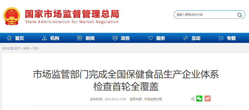 近日,市场监管总局发布信息,经过五年不懈努力,截至目前,已完成全国在产在营保健食品生产企业体系检查首轮全覆盖,累计完成体系检查2520家次,覆盖率达到140%,推动保健食品抽检合格率连续5年保持在99%以上,促进整个行业食品安全管理水平明显提升。