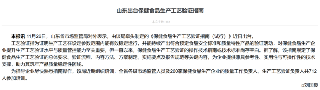11月26日,山东省市场监管局对外表示,由该局牵头制定的《保健食品生产工艺验证指南(试行)》近日出台。