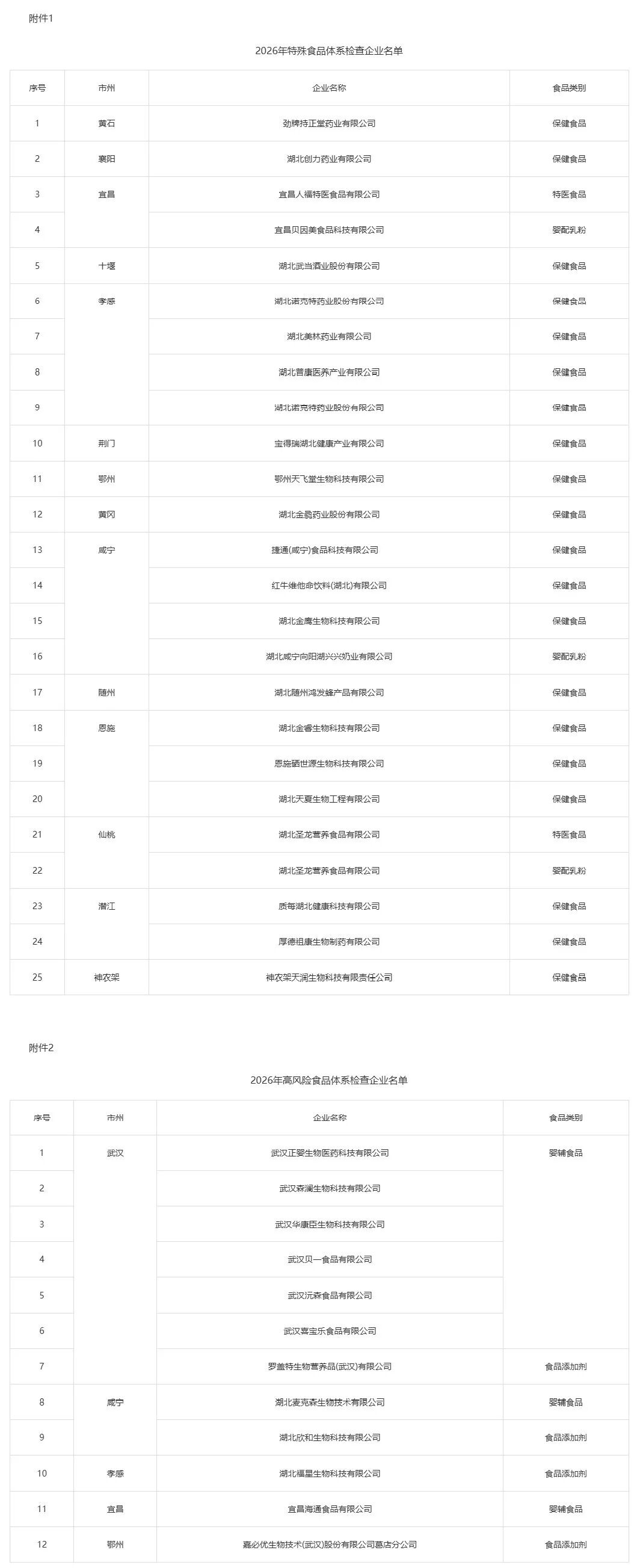 按照市场监管总局“有关省级市场监管部门‘每年组织对本辖区所有婴幼儿配方乳粉和特殊医学用途配方食品生产企业开展体系检查、每年组织开展保健食品体系检查的企业数量原则上不低于本辖区保健食品生产企业总数的20%’”要求,结合我省监管实际,省局今年拟对武汉市外25家特殊食品生产企业(附件1)、全省12家高风险食品生产企业(附件2)开展体系检查(若因停产等原因不能开展体系检查,由省局适时调整检查对象)。